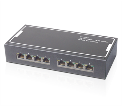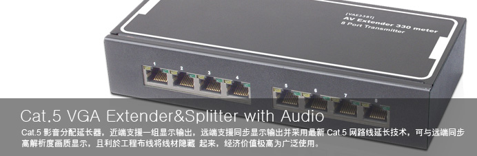 VAE338T 为 8 口的 Cat.5 音视频分配延长器,近端支持一组显示输出,远程支持 8 组同步显示输出并