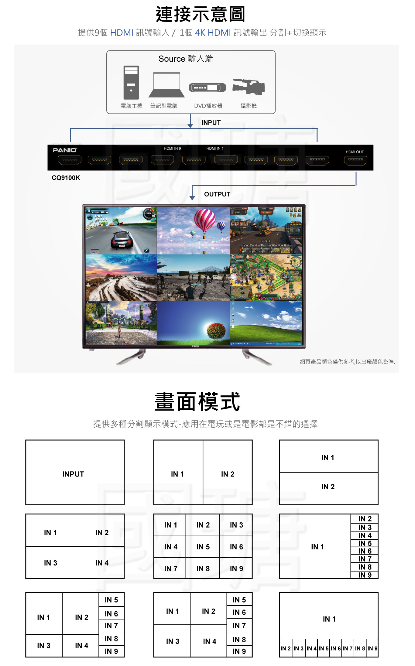 • 內建 11 種顯示模式:9 分割 / 8 分割 / 4 分割 / 2 分割 / 1 大 8 小 / 4 大 5 小 / 全螢幕…等(共 11 種)。