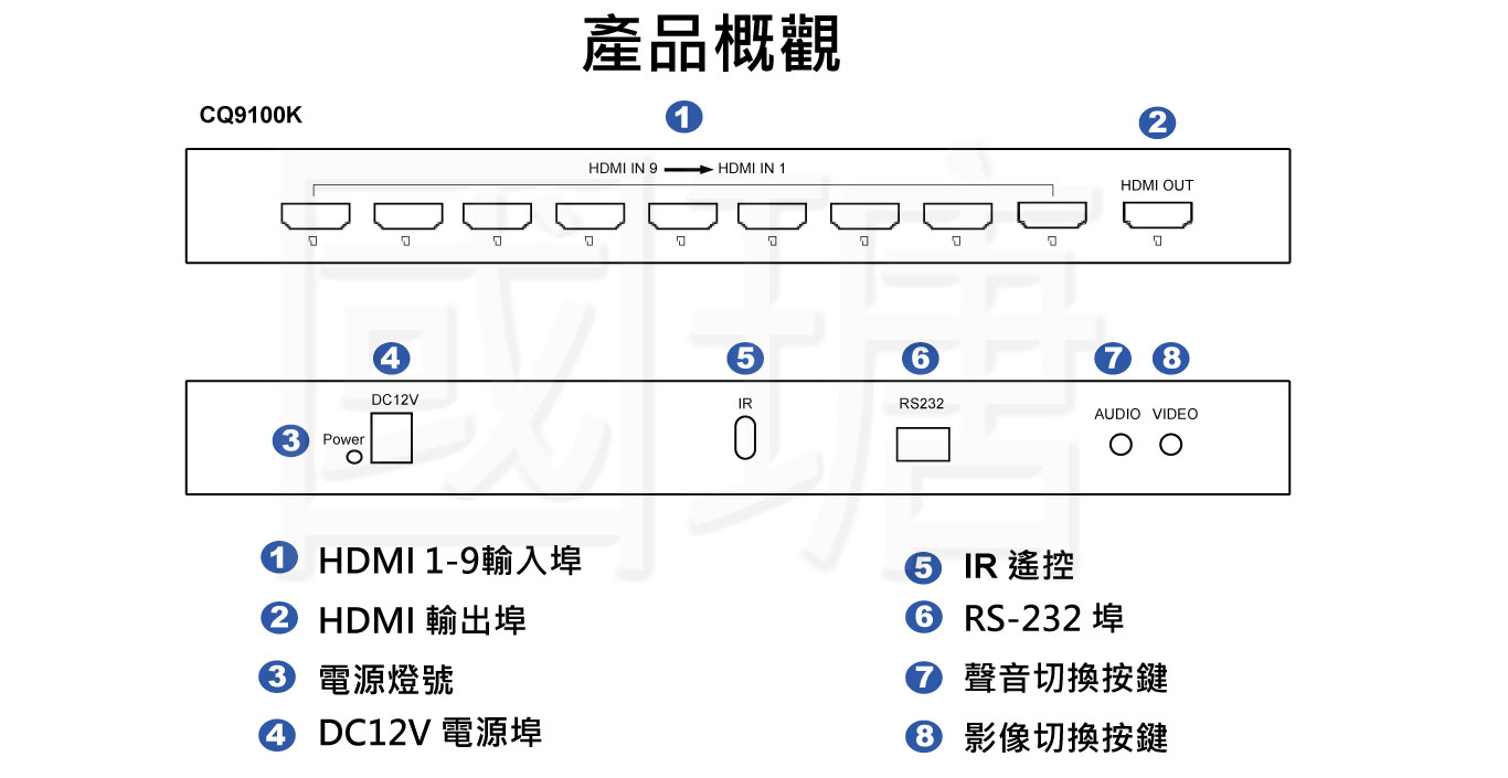 輸入介面 9 × HDMI、1 × RS-232、1 × RJ-45(可客製,現階段無功能)