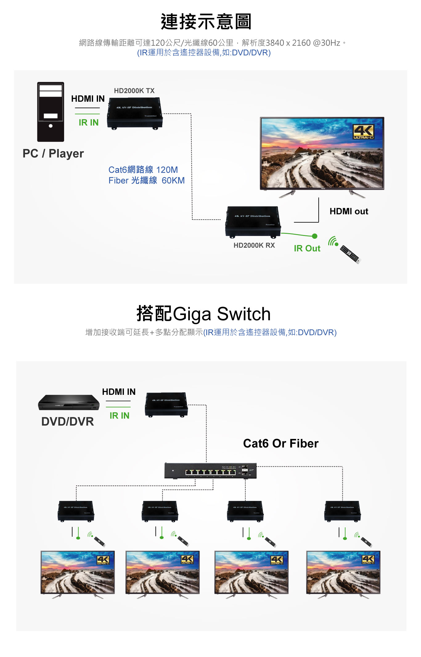透過光纖線 或 網路線將 4K 30Hz訊號延長至遠方顯示.光纖延伸至最遠60公里距離,Cat6延伸至最遠120米距離 (8芯線材全部接滿).